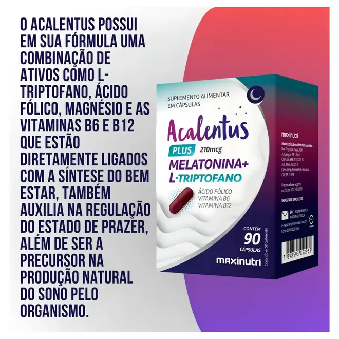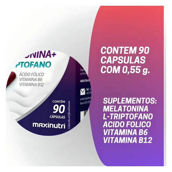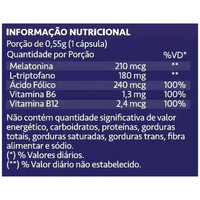 Melatonina, L triptofano, cloridrato de piridoxina, ácido fólico, cianocobalamina, lubrificante metasilicato, ácido de magnésio, excipiente amido de milho, antiumectantes estearato de magnésio e dióxido de silício, cápsula gelatina, corantes azorrubina dióxido de titânio, vermelho 40 amarelo crepúsculo e azul brilhante. NÃO CONTÉM GLÚTEN.