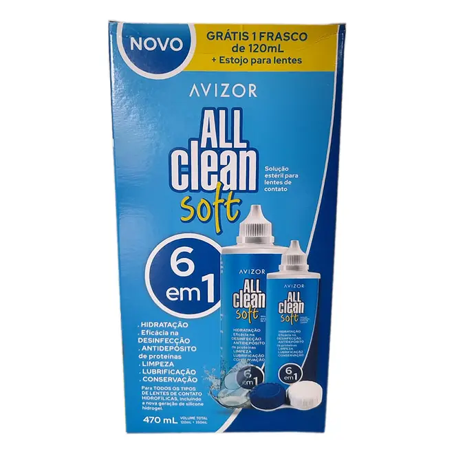 A Solução Multiuso Avizor All Clean Soft 6 em 1 é ideal para quem busca um cuidado completo e eficaz com suas lentes de contato. Sua fórmula avançada oferece hidratação, desinfecção, remoção de depósitos de proteínas, limpeza, lubrificação e conservação, garantindo máxima proteção e conforto para os olhos. Adequada para lentes de contato gelatinosas e silicone hidrogel, esta embalagem promocional inclui 470ml + ganhe 120ml e um estojo para lentes, proporcionando praticidade no uso diário. Mantenha suas lentes sempre limpas e confortáveis com a qualidade Avizor!