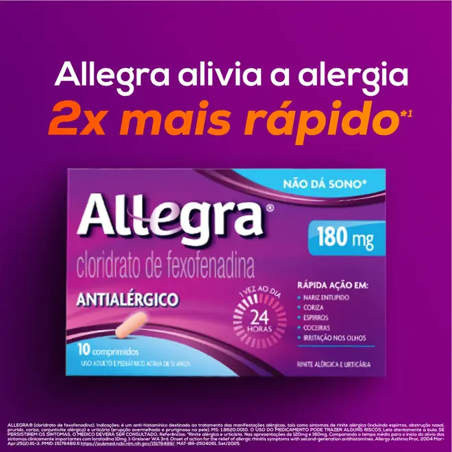 Allegra® (cloridrato de fexofenadina) é um anti-histamínico que não dá sono¹, indicado para o tratamento dos principais sintomas da rinite alérgica e urticária, como espirros, nariz entupido, coriza e coceiras. Recomendado para uso adulto e pediátrico a partir dos 12 anos, o antialérgico Allegra® age por 12 horas¹ e proporciona alívio rápido¹ dos sintomas de alergia*.