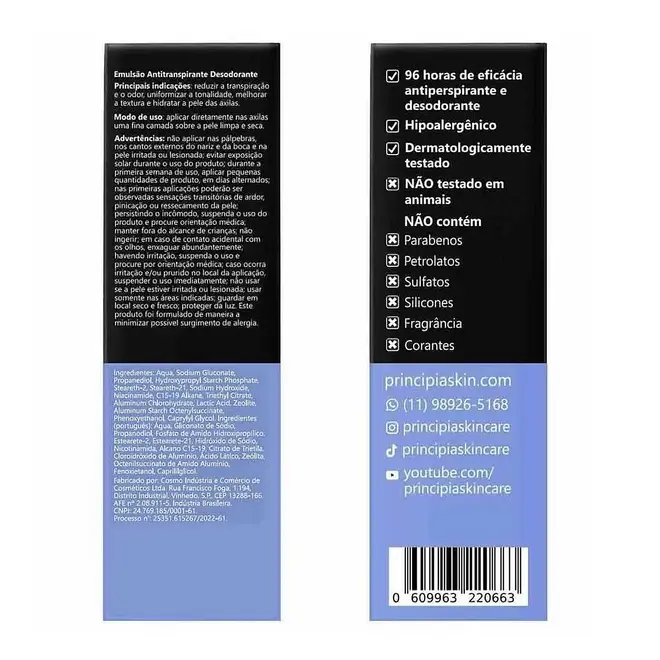 Diga adeus ao suor excessivo e ao desconforto com o Principia AD-01 Antitranspirante Desodorante. Com uma fórmula poderosa e eficaz, ele vai muito além de um simples desodorante: trata e cuida da pele ao mesmo tempo. Sua combinação de 20% de Cloridrato de Alumínio garante o controle da transpiração, enquanto os 5% de Ácido Lático promovem uma esfoliação suave que melhora a textura da pele. Já os 5% de Niacinamida ajudam a uniformizar o tom, hidratar e suavizar manchas escuras nas axilas.