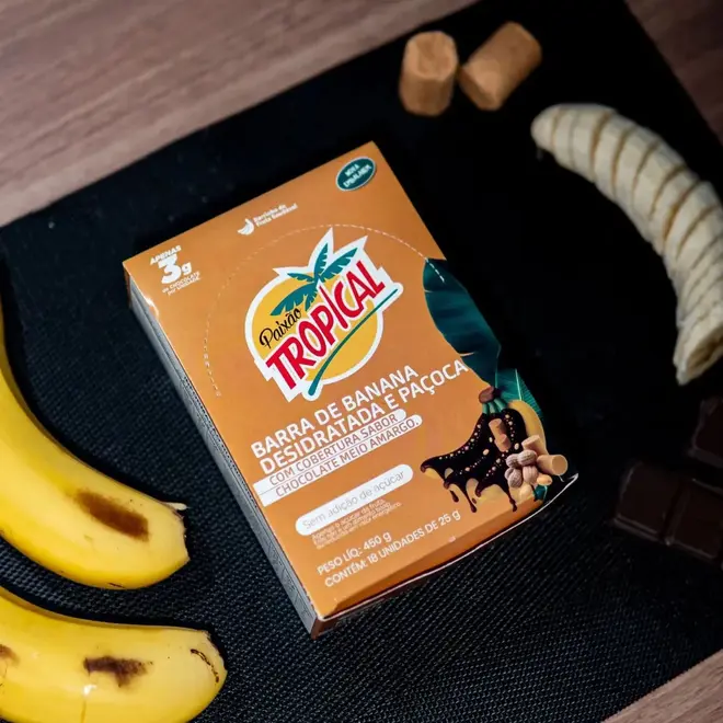 Produzido com fatias selecionadas de banana desidratada, cobertas com paçoca cremosa e finalizadas com uma camada de chocolate meio amargo, o produto entrega o equilíbrio perfeito entre doçura natural, crocância e intensidade.