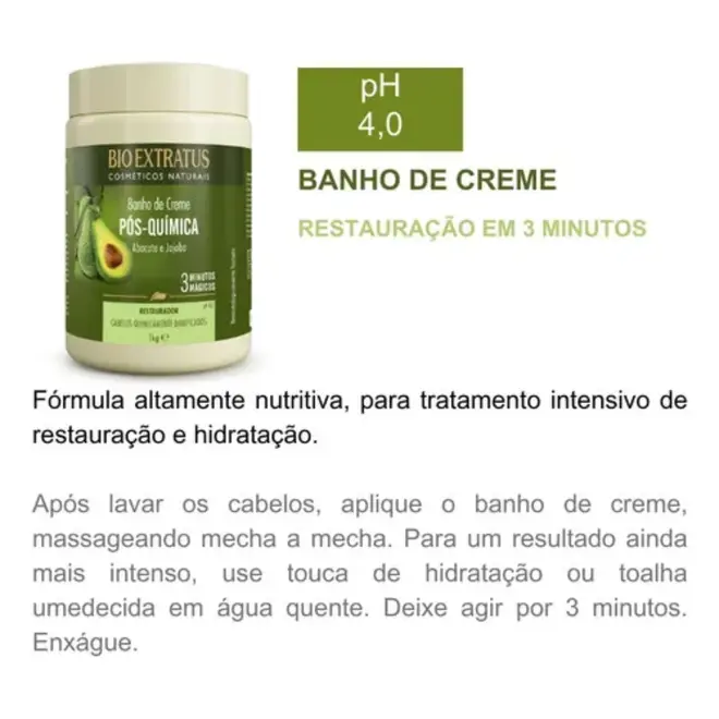 O Banho de Creme Bio Extratus Pós-Química 1kg é um tratamento restaurador indicado para cabelos quimicamente danificados.