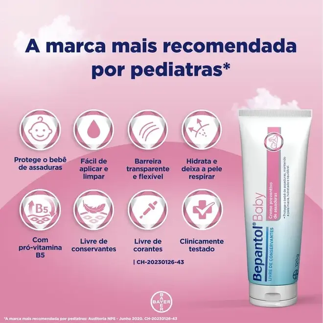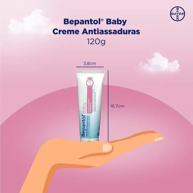 O Bepantol Baby é um creme antiassaduras desenvolvido especificamente para bebês, com uma fórmula composta por vitamina B5, óleo de amêndoas e lanolina. É um produto hipoalergênico, sem corantes, conservantes e perfume, criado para cuidar da pele delicada infantil. Serve para proteger, hidratar e fortalecer a pele do bebê contra assaduras, formando uma camada transparente protetora que pode ser acompanhada a cada troca de fralda, ajudando a reforçar a defesa natural da pele do bebê.