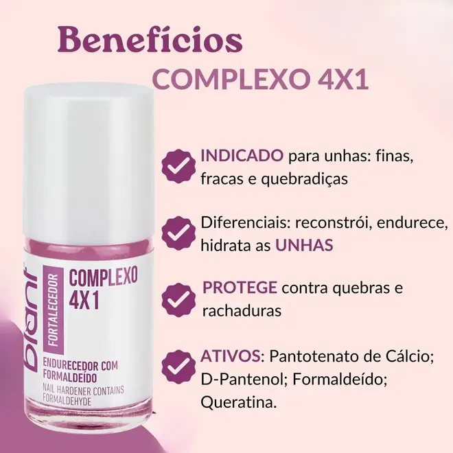 Fórmula especial que reforça a estrutura natural das unhas, deixando-as mais duras, brilhantes, hidratadas e resistentes. Indicado para unhas finas, fracas e quebradiças Diferenciais: • Reconstrói; • Endurece; • Hidrata; • Protege contra quebras e rachaduras. Ativos: Pantotenato de Cálcio; D-Pantenol; Formaldeído; Queratina.