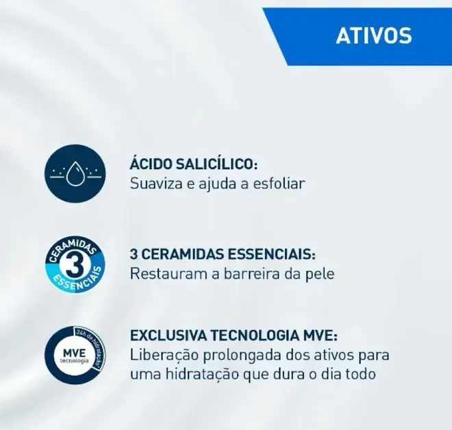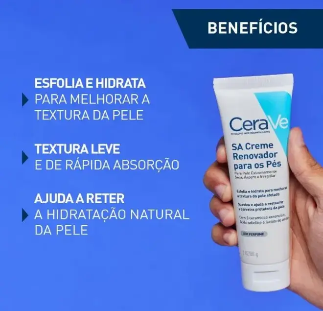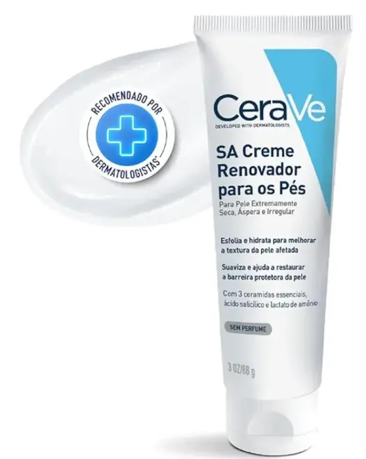 Desenvolvido com dermatologistas, 3 ceramidas essenciais e a exclusiva tecnologia MVE com liberação controlada e contínua de ingredientes ativos de hidratação, o CeraVe Creme Renovador para os Pés é formulado com Ácido Hialurônico, Ácido Salicílico, Niacinamida, Glicerina, Fitoesfingosina e Colesterol para hidratar, apaziguar, esfoliar, suavizar a pele e ajudar restaurar a barreira cutânea protetora dos pés. Indicado para pele extremamente seca, áspera e irregular. Adequado para pele gretada e fissurada. Sem perfume e não comedogênico. CeraVe é a marca número 1 recomendada por dermatologistas nos EUA*.