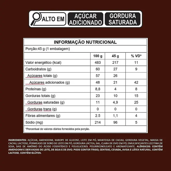 CONTÉM AMENDOIM E DERIVADOS DE LEITE, SOJA E OVO. PODE CONTER LÁTEX NATURAL E DERIVADOS DE TRIGO, CENTEIO, CEVADA E AVEIA.CONTÉM LACTOSE. CONTÉM GLÚTEN.