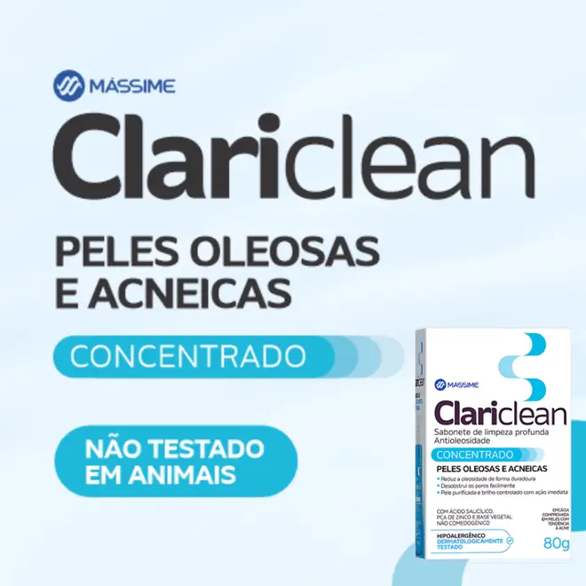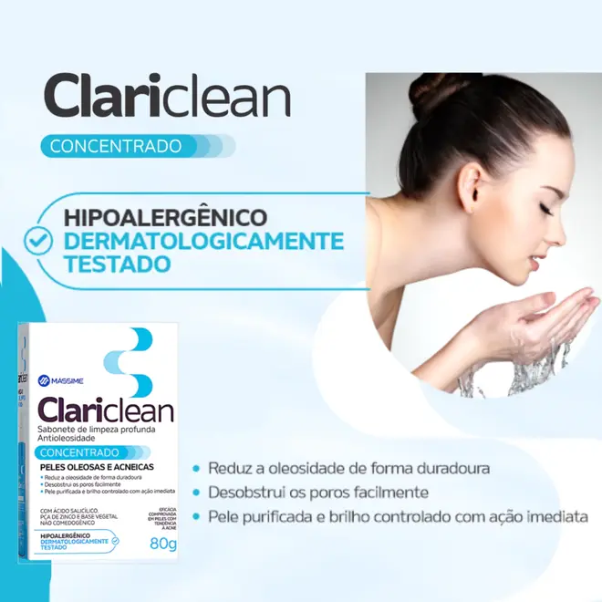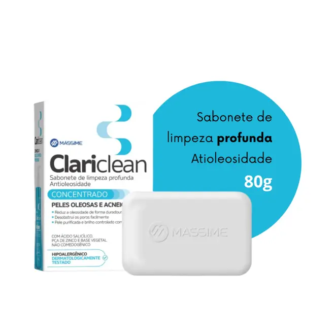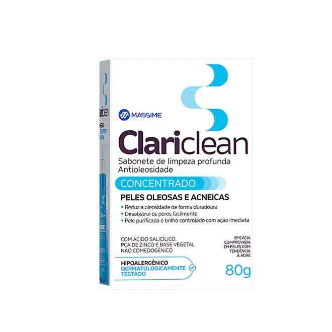 Experimente o Sabonete Facial Clariclean Concentrado em Barra e fique livre dos problemas causados pela oleosidade excessiva e acne. Com uma fórmula concentrada que combina Ácido Salicílico, com outros componentes, este sabonete desobstrui poros dilatados, reduz a oleosidade de forma duradoura e tem eficácia comprovada contra a acne.