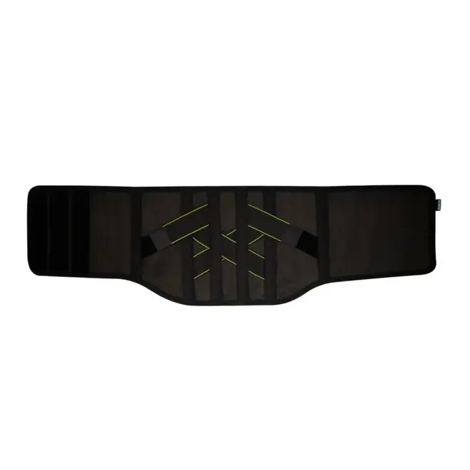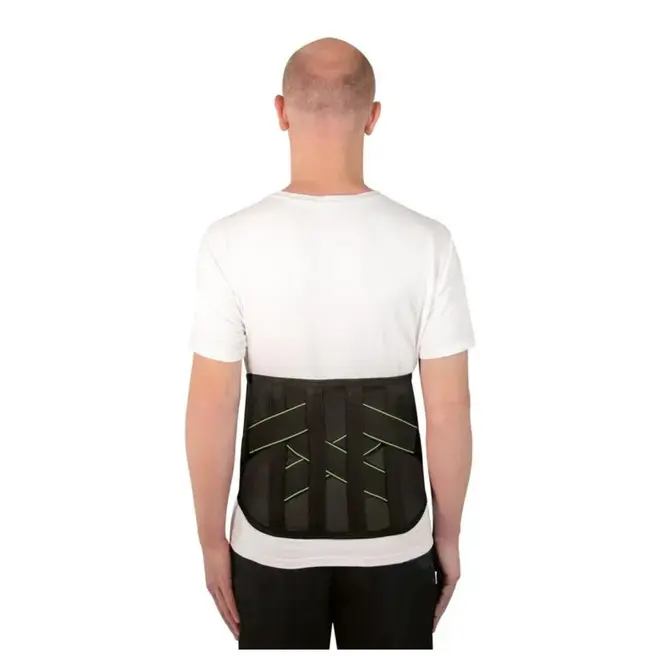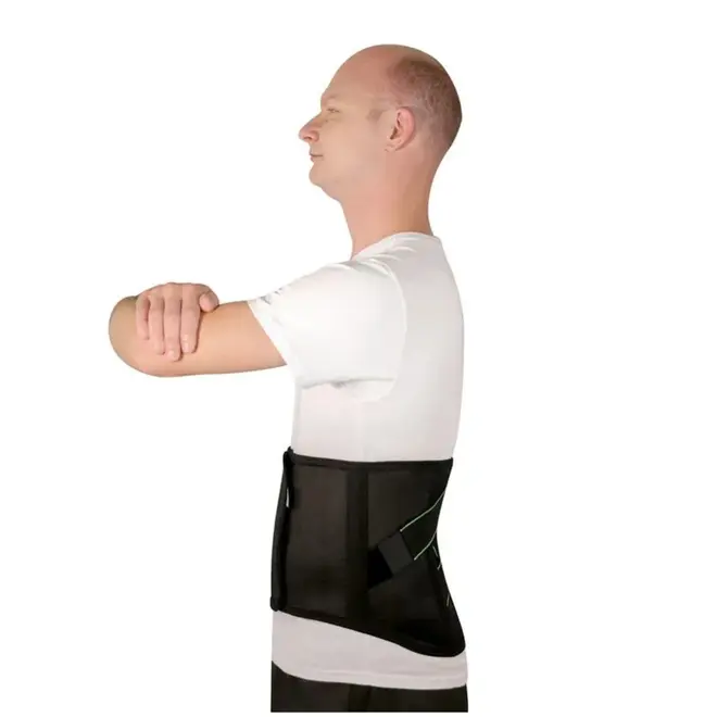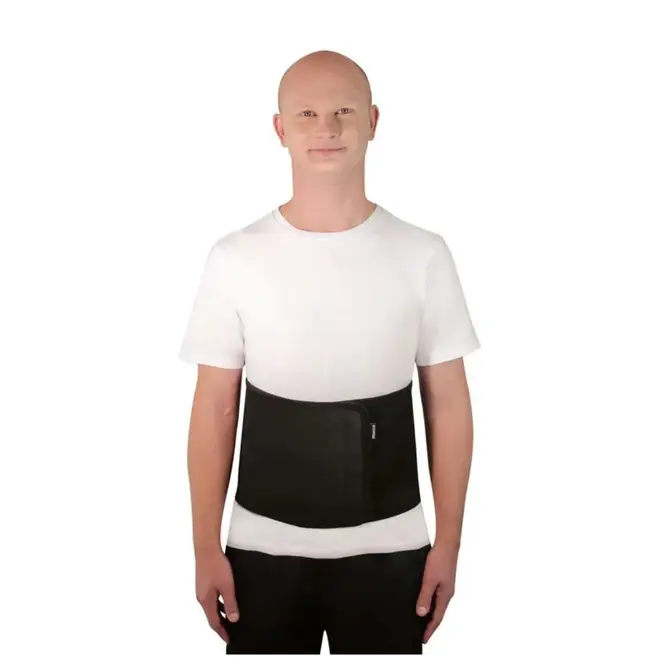 Confeccionado em elástico resistente é ajustável por fechos aderentes e possui reforço lateral, indicado para a região lombossacral.