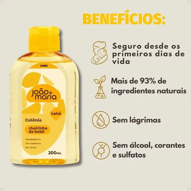 A colônia João e Maria foi especialmente desenvolvida para proporcionar uma fragrância pura e delicada, com mais de 91% de ingredientes naturais, respeitando a sensibilidade da pele dos pequenos desde os primeiros dias de vida. Perfeita para o uso diário, proporciona uma sensação de limpeza e carinho, sem comprometer a saúde e a segurança do bebê.