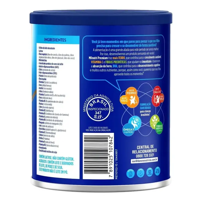 A fórmula contém leite em pó integral, óleos vegetais, cálcio, vitaminas (A, C, D, E), minerais essenciais como ferro e zinco, além de fibras alimentares e outros nutrientes importantes para garantir uma nutrição completa e equilibrada.