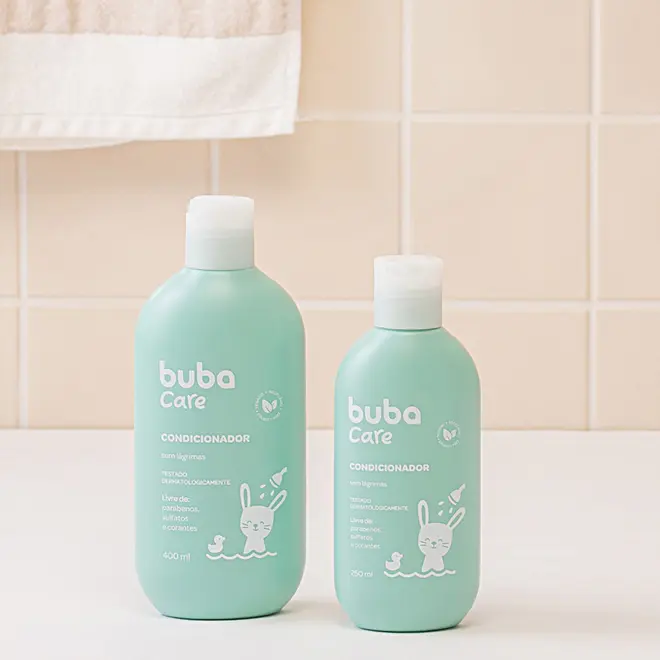 Após lavar os cabelos do pequeno com o Shampoo Buba Care, aplique o condicionador Buba Care delicadamente com a palma das mãos e, em seguida, enxágue bem. Pode ser usado diariamente.