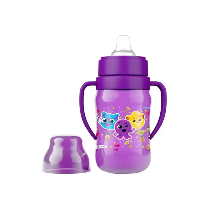 O modelo conta com alças laterais ergonômicas, perfeitas para que as mãos pequenas da criança consigam segurar o copo com firmeza. Possui um bico macio que não agride as gengivas sensíveis e uma tampa protetora que mantém a higiene do bico, tornando-o ideal para passeios e uso escolar.