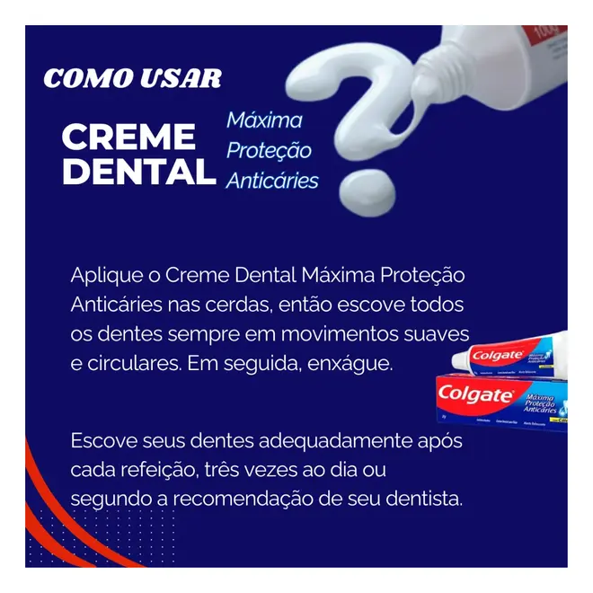 Aplicar pequena quantidade do creme dental na escova e escovar os dentes após as refeições ou conforme orientação do dentista. Escovar por aproximadamente 2 minutos e evitar ingerir o produto.