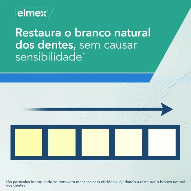 O creme dental Elmex Sensitive Whitening conta com tecnologia ProArgin + CalSeal e partículas branqueadoras que proporcionam alívio imediato da sensibilidade e proteção prolongada, além de promover o branqueamento dos dentes. A tecnologia ProArgin atua selando os canais que levam ao centro do dente, bloqueando a sensibilidade de forma instantânea. Juntamente com a CalSeal, cria uma barreira protetora ao redor dos túbulos dentinários expostos, oferecendo proteção adicional contra a sensibilidade, enquanto o flúor ajuda na prevenção da cárie. As partículas branqueadoras removem manchas de maneira eficaz, contribuindo para a recuperação da cor natural dos dentes, garantindo um polimento seguro da superfície dentária sem provocar sensibilidade.