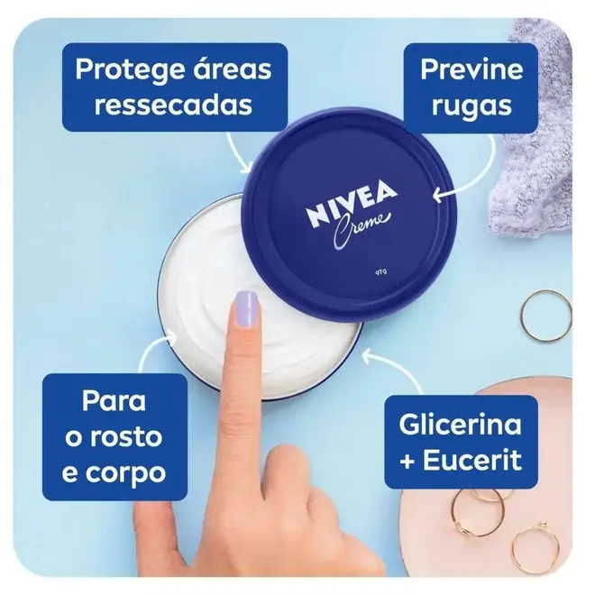 Indicado para todos os tipos de pele, o NIVEA Creme é o aliado perfeito para manter sua pele saudável e protegida em qualquer estação do ano. Além disso, sua tradicional fragrância NIVEA proporciona uma sensação de frescor e conforto.