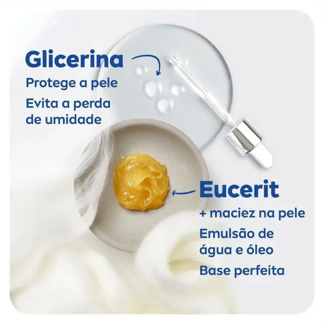 Composição: Fórmula enriquecida com Eucerit e glicerina, que oferecem um toque suave e hidratação poderosa para a pele.