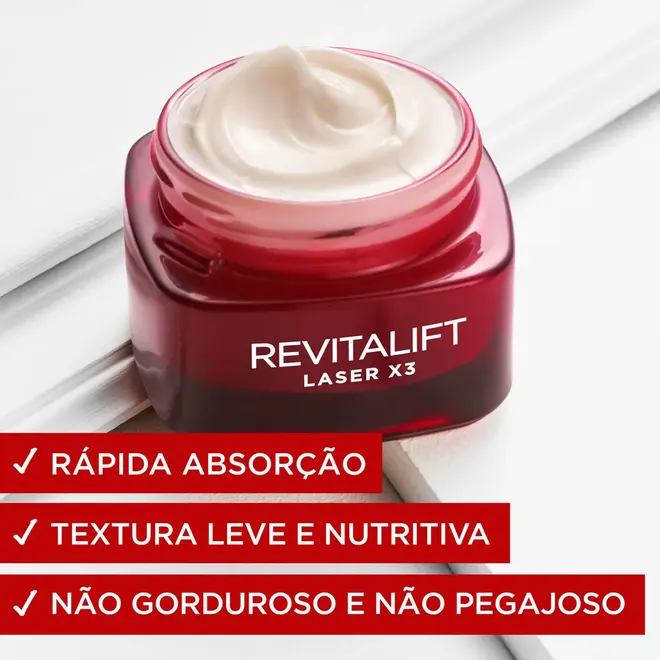 Dê um passo adiante no cuidado da sua pele! Com o L'Oréal Paris Revitalift Creme Facial Anti-idade Laser X3 Diurno 50ml, e tenha a pele que sempre sonhou! *Classificação clínica em 60 mulheres INCLUSO: 1 X L'Oréal Paris Revitalift Creme Facial Anti-idade Laser X3 Diurno 50ml F.A.Q: O que faz o creme facial anti-idade ser eficaz? O creme facial anti-idade é eficaz ao suavizar rugas e linhas de expressão, remodelar os contornos do rosto e redensificar a pele.