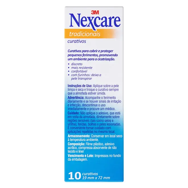 O Curativo Nexcare Tradicional com 10 unidades é indicado para a proteção de pequenos cortes, arranhões e ferimentos superficiais. Possui material flexível e confortável, adaptando-se bem à pele e proporcionando proteção contra sujeiras e agentes externos.