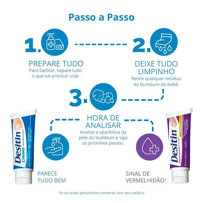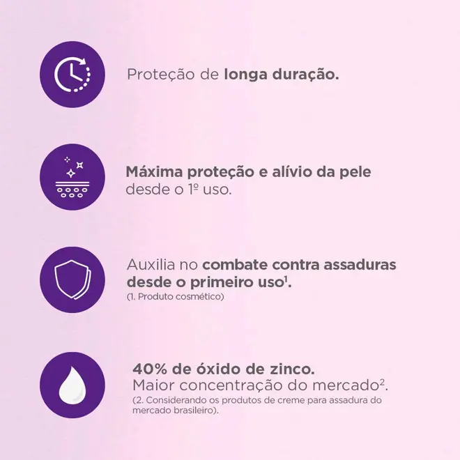 Após limpar delicadamente a pele do bebê, aplicar uma camada espessa do produto em toda a região coberta pela fralda.