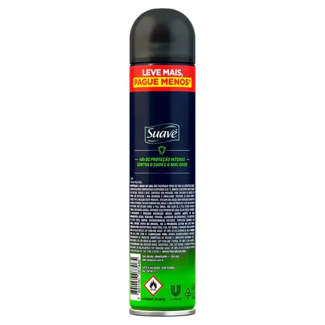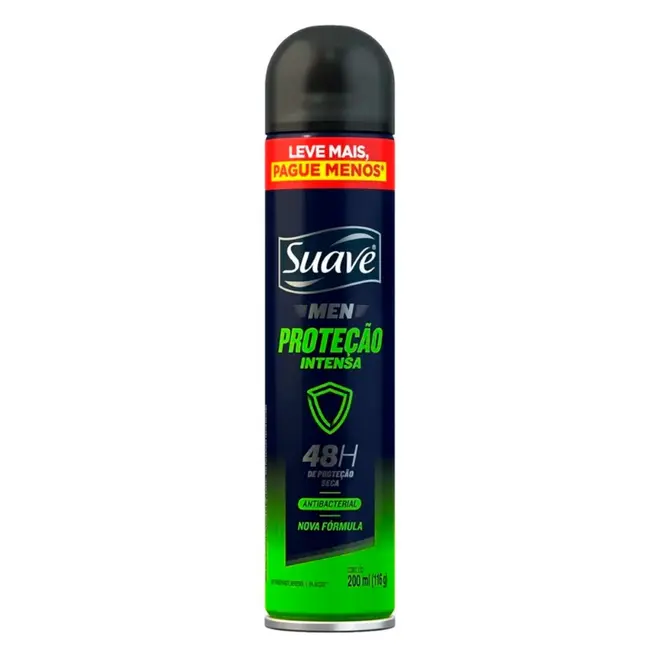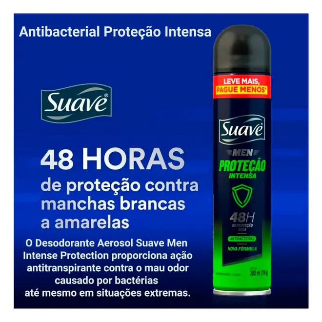 O Antitranspirante Aerosol Suave Men Proteção Intensa foi desenvolvido especificamente para atender às necessidades do corpo masculino, oferecendo máxima performance contra a transpiração. Sua nova fórmula combina uma poderosa ação antibacteriana com a tecnologia de proteção seca, garantindo que você se sinta limpo e confiante por muito mais tempo.