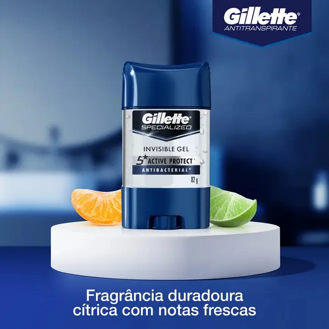 Fique protegido com o antitranspirante Gillette Specialized Gel Invisible, seu sistema 5✯ ACTIVE PROTECT te oferece proteção instantânea contra suor e mau cheiro sem manchas brancas na aplicação. Experimente sua fragrância duradoura com notas cítricas de limão, lima e tangerina, com notas verdes. A sua fórmula antibacteriana ** te mantém protegido mesmo durante os treinos mais intensos.