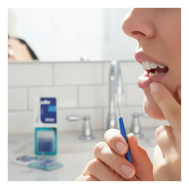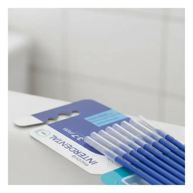 Inserir a escova suavemente entre os dentes e movimentar para frente e para trás para remover resíduos. Enxaguar após o uso.