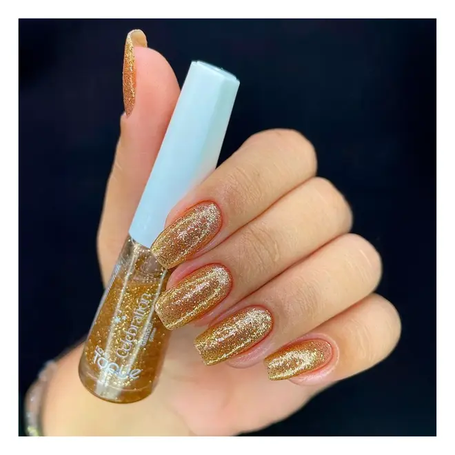 O Esmalte Novo Toque na cor Glamour, da linha Celebration, é a definição de luxo e brilho para as suas unhas. Este esmalte de acabamento em glitter apresenta partículas densas em um tom dourado rosé sofisticado, projetado para refletir a luz de forma intensa e criar um efeito tridimensional deslumbrante.