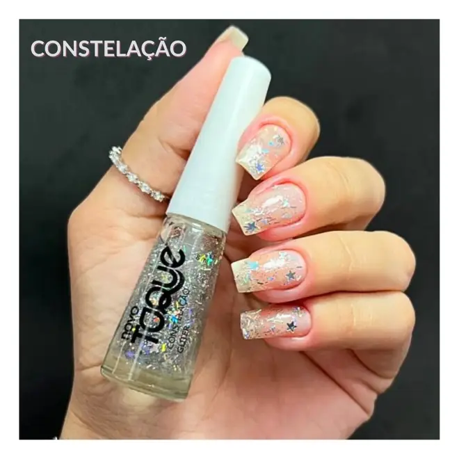 O Esmalte Novo Toque na cor Constelação é uma verdadeira explosão de brilho para as suas unhas. Este esmalte de acabamento glitter apresenta partículas prateadas e holográficas de diferentes tamanhos, criando um efeito multidimensional que reflete a luz de maneira intensa, remetendo ao brilho de um céu estrelado.