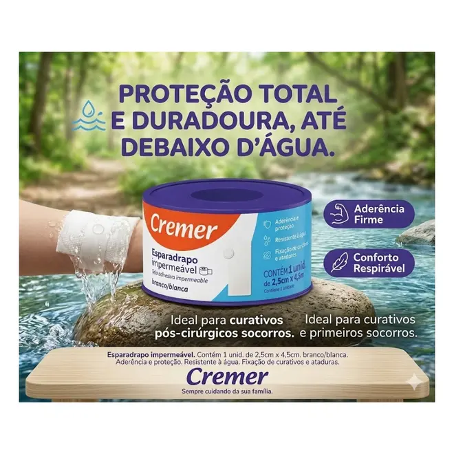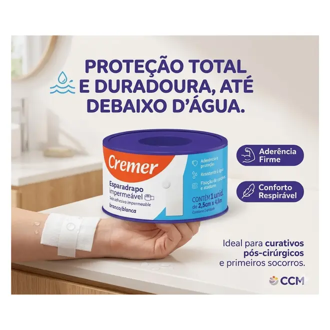 O Esparadrapo Impermeável Cremer Branco é uma tela adesiva desenvolvida para proporcionar máxima aderência e proteção em cuidados de saúde. Composto por tecido de algodão tratado, este produto é resistente à água, garantindo que o curativo permaneça fixo e seguro mesmo em condições de umidade.