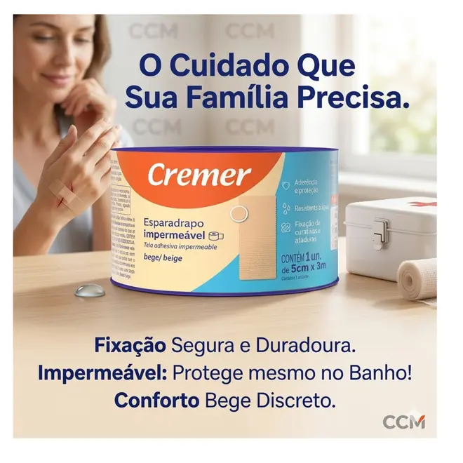 O Esparadrapo Impermeável Cremer é uma tela adesiva desenvolvida para oferecer alta aderência e proteção em diversos cuidados de saúde. Composto por um tecido que recebe tratamento impermeabilizante, ele garante a fixação de curativos mesmo em contato com a água ou umidade.