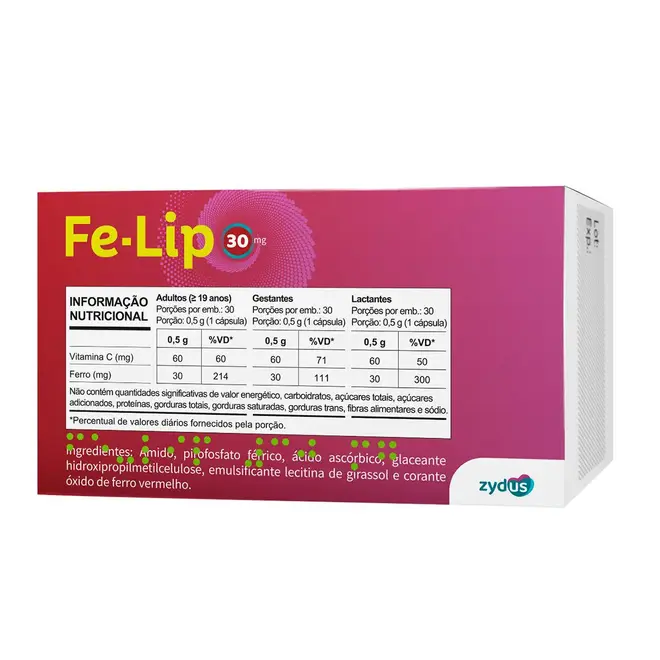 Suplemento Alimentar Fe-Lip 15 mg é um suplemento alimentar de ferro em cápsulas que contém pirofosfato férrico na forma lipossomal, formulado para complementar a dieta diária quando há necessidade de reposição de ferro no organismo. Sua fórmula inclui vitamina c, que auxilia na absorção do ferro pelo organismo, contribuindo para prevenir e tratar casos de anemia ferropriva.
