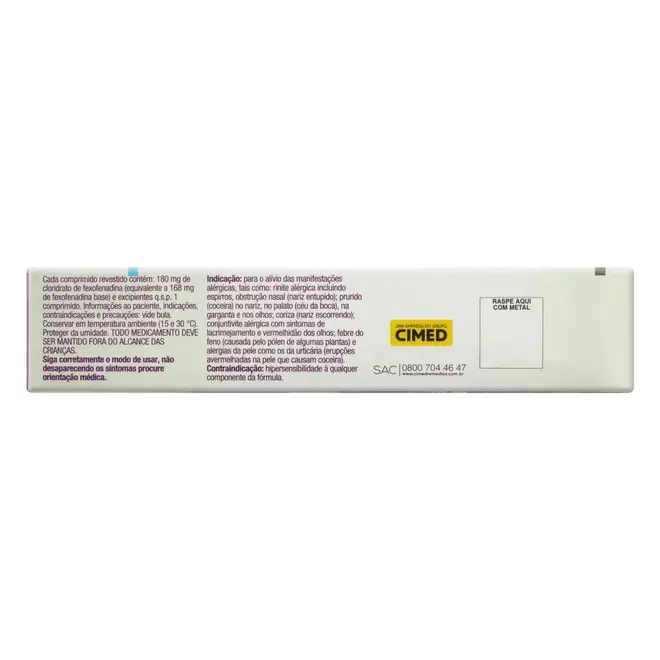 Cada comprimido revestido contém: 180mg de cloridrato de fexofenadina (equivalente a 168mg de fexofenadina base)