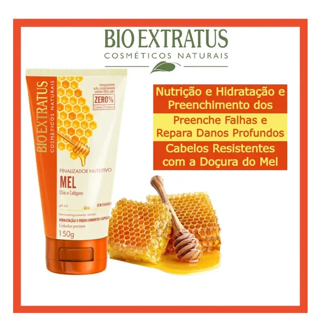 O Bio Extratus Finalizador Nutritivo Mel 150g é um creme sem enxágue desenvolvido para hidratar, nutrir e preencher a fibra capilar, especialmente indicado para cabelos porosos.