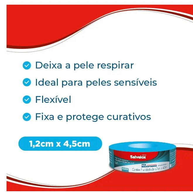 A Fita Microporosa Salvelox (1,2cm x 4,5m) é ideal para peles sensíveis, oferecendo fixação suave e segura de curativos.