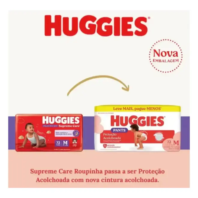 A Fralda Huggies Supreme Care Roupinha M foi desenvolvida para oferecer máximo conforto, proteção e liberdade de movimento para o bebê durante o dia e a noite.