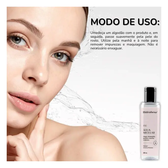 Aplicar a Água Micelar Hidrabene em um algodão e passar suavemente sobre o rosto, olhos e lábios até remover todas as impurezas ou maquiagem.