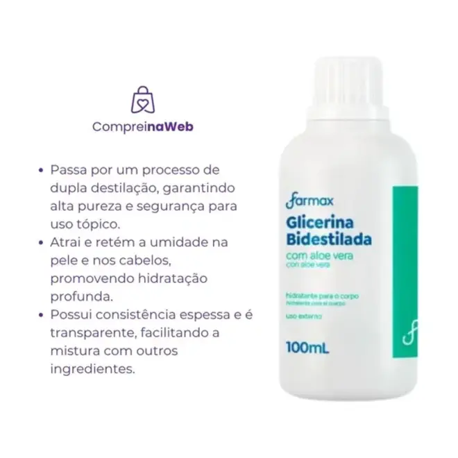A Glicerina Bidestilada Farmax com Aloe Vera é um poderoso hidratante para o corpo, formulado para proporcionar maciez e proteção à pele. A combinação da glicerina, conhecida por suas propriedades umectantes, com o extrato de Aloe Vera, potencializa a hidratação, ajudando a reter a umidade natural da pele e prevenindo o ressecamento.