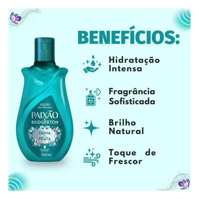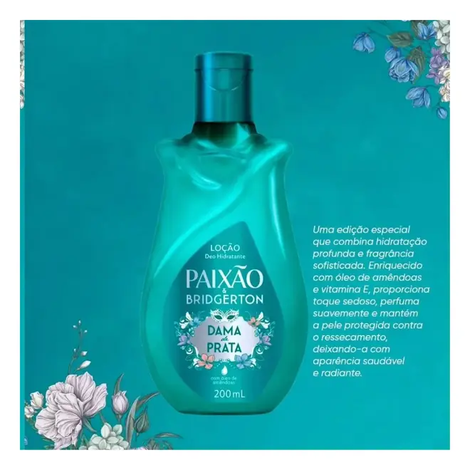 A Loção Deo Hidratante Paixão Bridgerton Dama de Prata oferece hidratação intensa e fragrância sofisticada para o cuidado diário da pele.