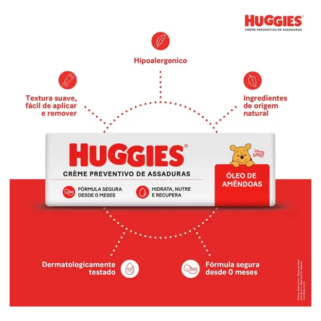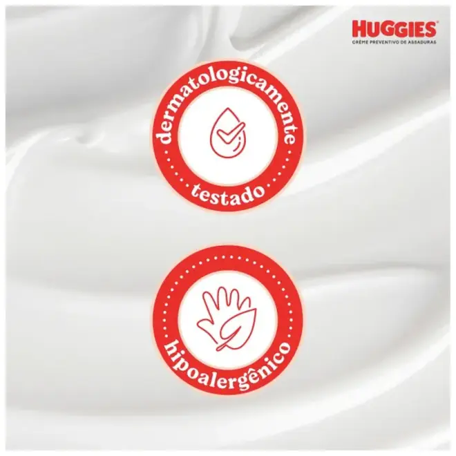 HIDRATA, NUTRE E RECUPERA: O creme preventivo Huggies foi desenvolvido especificamente para hidratar, nutrir e recuperar a pele do seu bebê, evitando o aparecimento de irritações cutâneas sem ação terapêutica.
