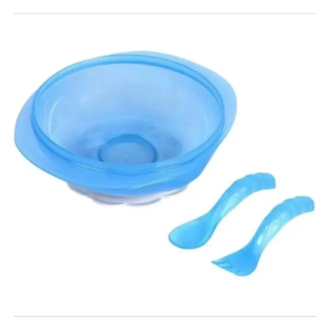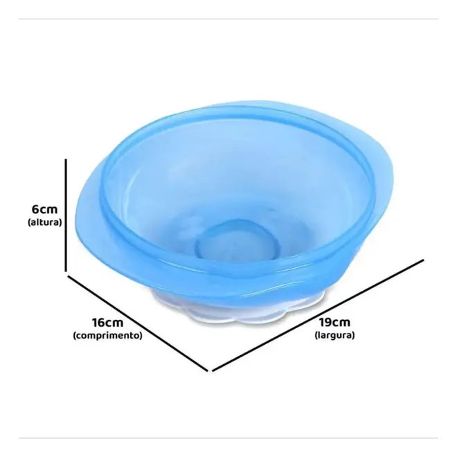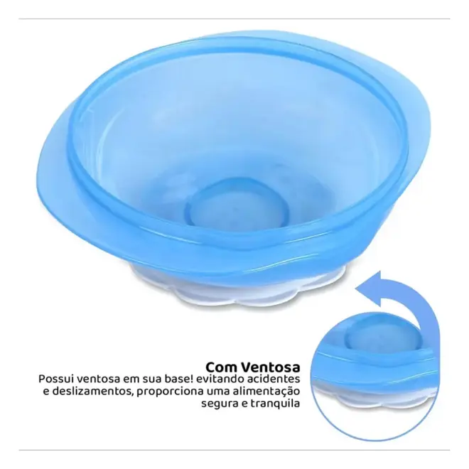 O bowl possui ventosa na base, que ajuda a fixar o prato na mesa ou na bandeja da cadeira de alimentação, evitando que o bebê derrube ou deslize o recipiente durante a refeição.
