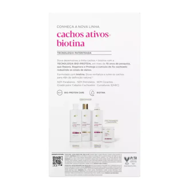 O Kit Dove Cachos Ativos + Biotina foi desenvolvido especialmente para cuidar dos cabelos cacheados dos tipos 3A, 3B e 3C, proporcionando nutrição intensa, definição duradoura e hidratação profunda desde a primeira lavagem.
