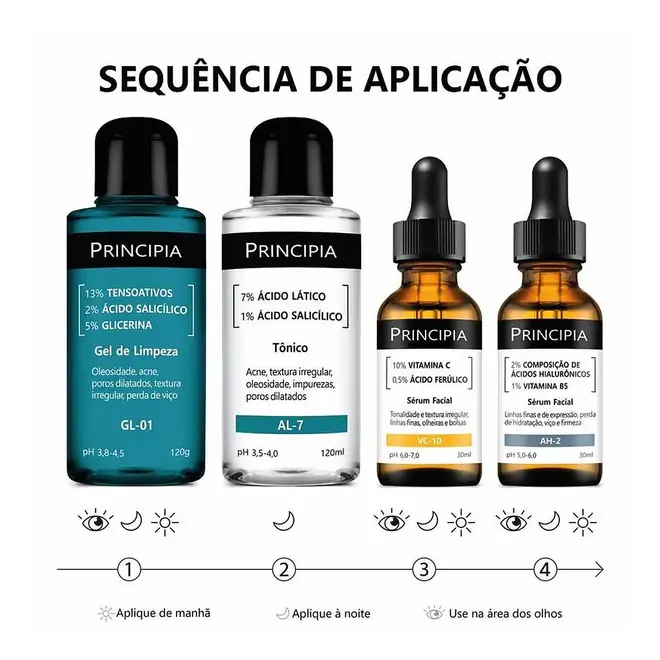 A aplicação deve ser feita em etapas: comece com o Gel de Limpeza Facial Principia; em seguida aplique o Tônico Facial AL-7; continue com o Sérum Antioxidante VC10 pela manhã; finalize à noite usando o Sérum HA2 antes dormir garantindo assim proteção integral durante o dia e a noite!