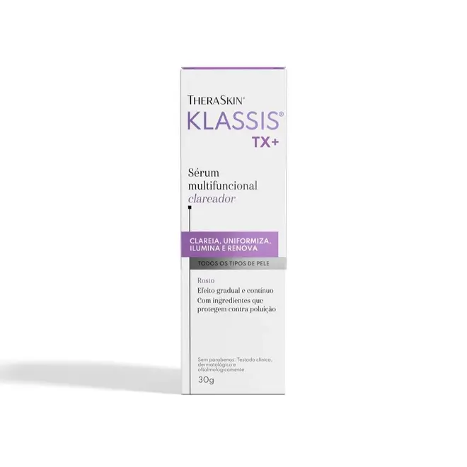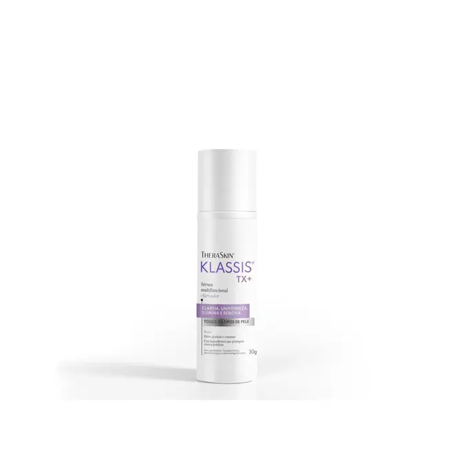Theraskin Klassis TX+ é o sérum clareador facial ideal para ser usado em todos os tipos de pele, inclusive as mais sensíveis Auxiliando na uniformização e clareamento, reduz as alterações causadas pela exposição solar, pela idade ou por disfunções hormonais, como acne e dermatites. Sua fórmula conta com ativos que proporcionam um clareamento da pele de forma multifuncional e progressiva. Os responsáveis por esse efeito são o Ácido Tranexâmico, o complexo pró-clareador e o Revivyl, ativos que, juntos, deixam a pele mais clara, rejuvenescida, iluminada e visivelmente mais uniforme. Possui uma textura leve e suave que oferece uma sensação refrescante e não gordurosa ao toque.