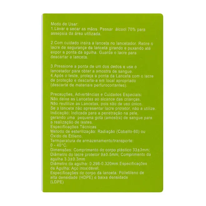 Cada lanceta é esterilizada por radiação gama, garantindo maior segurança e higiene durante o uso.