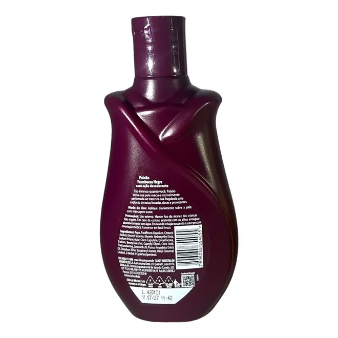 A Loção Deo Hidratante Paixão Framboesa Negra proporciona hidratação intensa e perfumação marcante para a pele. Sua fórmula contém óleo de amêndoas, ingrediente conhecido por auxiliar na nutrição e maciez da pele.