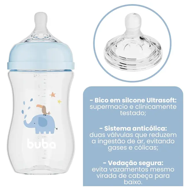 Fluxo Suave: Bico de silicone macio que permite uma alimentação tranquila e sem esforço. Sistema Anticólica: Reduz a ingestão de ar, proporcionando maior conforto durante as mamadas. Design Ergonômico: Fácil de manusear, ideal para as mãos dos pais e do bebê. Estampa Fofa: Tema de elefante azul que encanta com delicadeza e estilo.