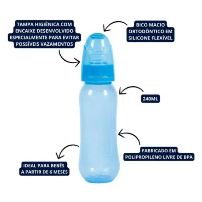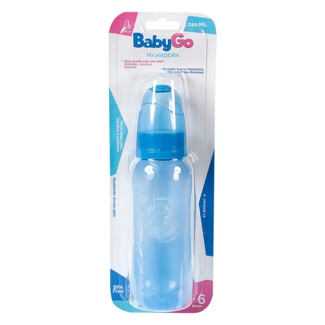 A Mamadeira Baby Go de 240ml foi projetada para oferecer conforto e segurança durante a alimentação do bebê. Com um design clássico na cor azul, o frasco possui formato ergonômico que facilita a pega, proporcionando maior firmeza para os pais e para a criança.