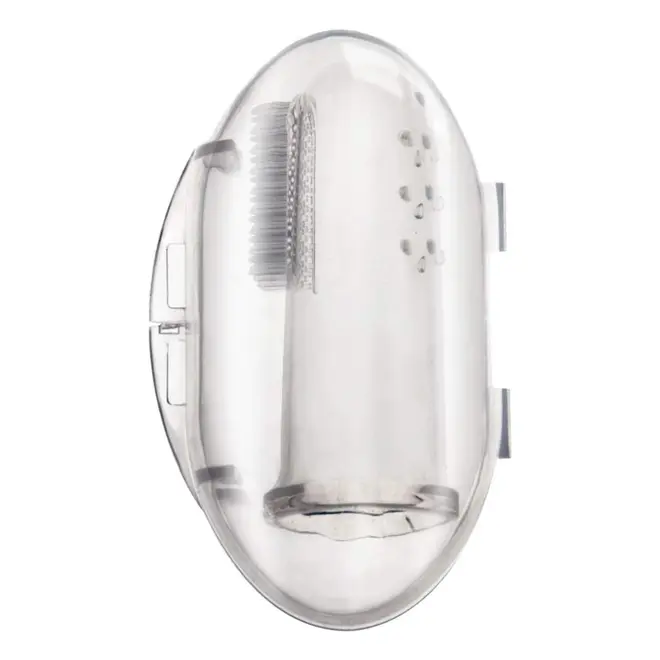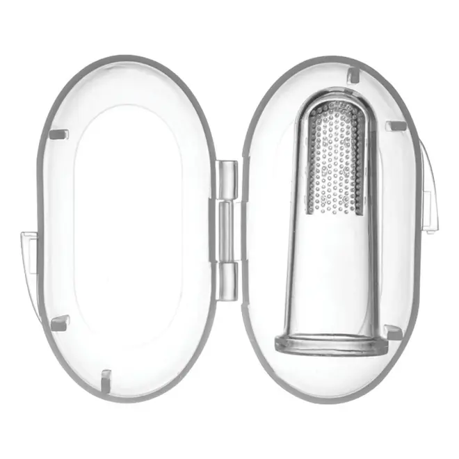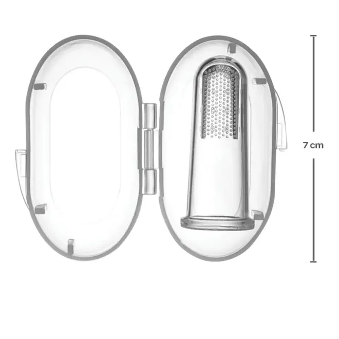 Seu formato de dedal permite que o adulto encaixe no dedo para realizar a limpeza ou massagem de forma prática e segura.