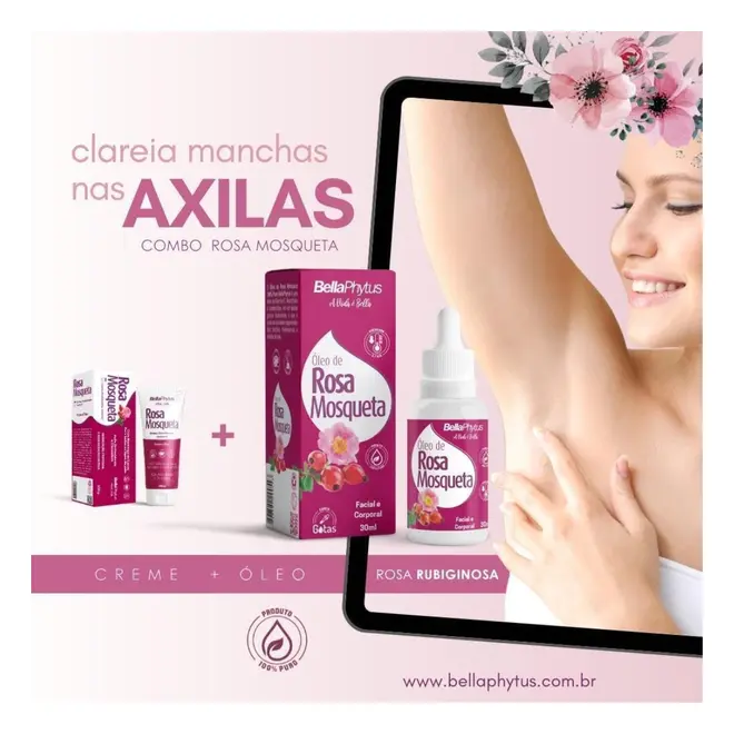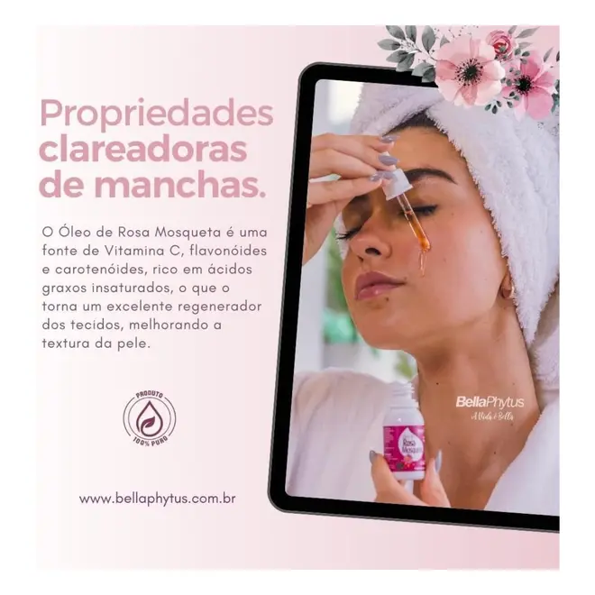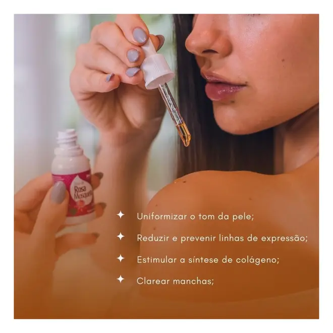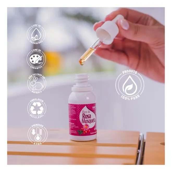 O Óleo de Rosa Mosqueta 100% Puro é uma fonte de vitamina c, flavonóides e carotenóides, rico em ácidos graxos insaturados, o que o torna um excelente regenerador dos tecidos, melhorando a textura da pele.