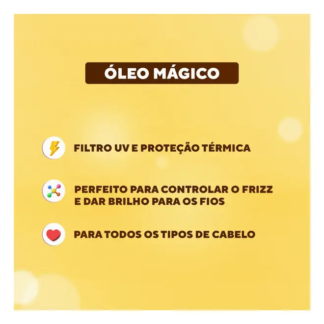 Sua fórmula conta com um blend de óleos nutritivos, que ajuda a reparar danos, reduzir o frizz e selar as pontas, deixando o cabelo mais saudável e alinhado. Possui textura leve, que não pesa nos fios, sendo ideal para todos os tipos de cabelo.